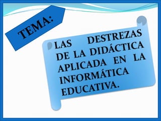Este documento trata sobre la didáctica y la informática educativa. Explica conceptos clave como didáctica general, diferencial y especial. También describe los componentes de la informática educativa y estrategias didácticas para trabajar con tecnologías de la información y comunicación. Finalmente, presenta principios del aprendizaje, recursos educativos y la importancia de los medios de comunicación en la enseñanza.