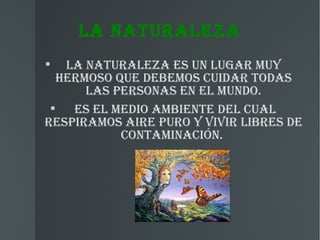 La naturaleza es un lugar hermoso que debemos cuidar. Es el medio ambiente del cual respiramos aire puro y vivimos libres de contaminación. La presencia del ser humano ha provocado cambios en la naturaleza modificándola de acuerdo a sus necesidades básicas. La presencia del clima también ha influido mucho en la naturaleza dependiendo de factores como el aire y agua, e interviene en el desarrollo de plantas y su vegetación.