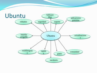 Este documento presenta información sobre el sistema operativo Ubuntu y sus aplicaciones de software libre como OpenOffice, correo electrónico, navegadores web, buscadores, redes sociales y las ventajas y desventajas de estas. Se resumen las características principales de cada una de estas herramientas de código abierto.