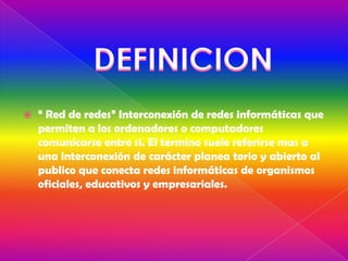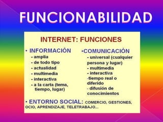 Internet es una red de redes informáticas que permite a computadoras comunicarse entre sí a nivel mundial. Ofrece varios beneficios como facilidad de uso, bajo costo, acceso a gran cantidad de información y servicios de forma rápida. Sin embargo, también plantea riesgos como la posibilidad de interceptar comunicaciones, exposición a contenidos inadecuados y dependencia excesiva. Las aplicaciones en internet son programas diseñados para realizar tareas específicas y se han vuelto muy populares debido a su versatilidad y facilidad de acceso para