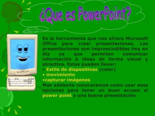 Este documento proporciona una introducción al uso de PowerPoint. Explica que PowerPoint es una herramienta de Microsoft Office para crear presentaciones visuales y atractivas. Luego detalla los pasos básicos para iniciar PowerPoint y crear una presentación, incluyendo la selección de estilos de diapositivas, agregar movimiento y animaciones, y capturar imágenes. El objetivo general es familiarizar a los lectores con las funciones básicas de PowerPoint para crear presentaciones efectivas.