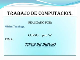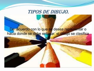 Este documento resume los diferentes tipos de dibujo, incluyendo dibujo artístico, técnico, geométrico, arquitectónico, mecánico, eléctrico, electrónico, geológico y topográfico. Cada tipo se define brevemente, describiendo sus características y usos principales.