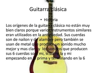 El documento resume brevemente la historia de diferentes tipos de guitarra como la clásica y eléctrica. También describe diferentes géneros musicales contemporáneos como el rock alternativo y pop rock. Define la música como el arte de organizar sonidos y silencios usando melodía, armonía y ritmo. Explica que la música está influenciada por la cultura y que su definición ha evolucionado con el tiempo.