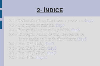 El documento describe diferentes tipos de buses internos y externos. Explica que los buses internos comunican las diferentes partes del microprocesador, mientras que los buses externos comunican la CPU con otras partes del sistema como la memoria y dispositivos de entrada y salida. Luego procede a definir conceptos como el ancho de bus, frecuencia de bus y ancho de bus de direcciones. Finalmente resume las características de buses específicos como ISA de 8 y 16 bits, PCI de 32 bits y EISA.