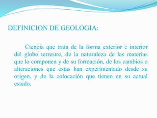 Este documento presenta una introducción a la geología. Define la geología como la ciencia que estudia la Tierra, incluyendo su composición, formación y cambios a lo largo del tiempo. Luego resume brevemente la historia de la geología desde la antigüedad hasta el desarrollo de la teoría de la tectónica de placas en el siglo XX. Finalmente, describe algunas de las ramas principales de la geología como la hidrología, la ingeniería civil y la geodinámica interna y externa.