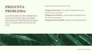 El documento trata sobre la contaminación ambiental causada por el mal manejo de basuras y residuos sólidos en la ciudad de Santiago de Cali. Explica que al crear conciencia en la gente a través de campañas de educación ambiental se puede reducir la contaminación. También describe los recursos naturales como el agua y su importancia, así como las causas y tipos de contaminación ambiental. Finalmente, presenta información sobre el manejo integral de residuos sólidos en Cali.
