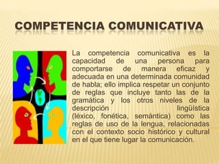 La competencia comunicativa se refiere a la capacidad de una persona para comportarse de manera eficaz y adecuada en una comunidad de habla respetando las reglas gramaticales, léxicas, fonéticas, semánticas y socioculturales de la lengua. Implica hablar, escuchar, leer y escribir de forma apropiada considerando al destinatario, organizando y transmitiendo las ideas de forma coherente y comprensible.