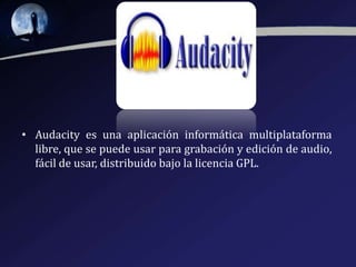 Audacity es una aplicación de código abierto multiplataforma para grabar y editar audio. Fue creada en 1999 por Dominic Mazzoni y Roger Dannenberg en la Universidad Carnegie Mellon y lanzada en 2000. Permite la grabación, edición y conversión de archivos de audio, así como la edición de múltiples pistas y la adición de efectos de sonido. Es compatible con Windows, Linux, Mac OS y Unix.