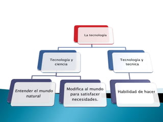 El documento describe la importancia de la tecnología para resolver inconvenientes humanos y mejorar la vida. Explica que la tecnología incluye artefactos tangibles como máquinas, así como los procesos y sistemas de los que forman parte. Además, proporciona definiciones de artefactos, procesos y sistemas tecnológicos.