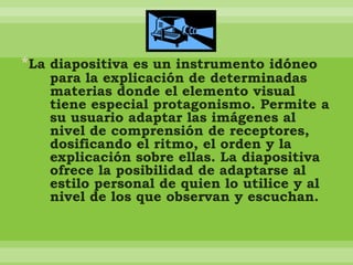 El documento describe las características y ventajas de usar diapositivas en la enseñanza. Las diapositivas permiten mostrar imágenes en gran escala que pueden captar la atención de los estudiantes y adaptarse al ritmo y nivel de comprensión del profesor. Algunas ventajas clave son que las diapositivas son brillantes, se pueden proyectar para toda la clase, y permiten que el profesor interactúe cara a cara con los estudiantes mientras explica el material.