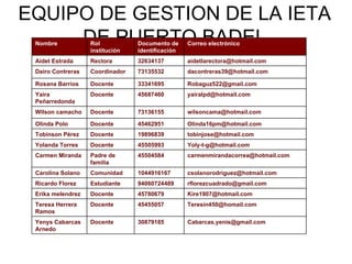 Este documento presenta la visión y misión de la Institución Educativa Técnica Agropecuaria y Acuícola de Puerto Badel. Incluye la lista de contactos del equipo de gestión de la institución, con sus nombres, correos electrónicos e identificaciones. La visión es ser reconocida como una institución líder en la formación de bachilleres técnicos en agropecuaria, acuicultura y nuevas tecnologías. La misión es comprometerse con la formación integral de estudiantes analíticos e investig