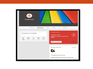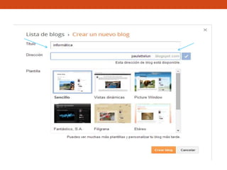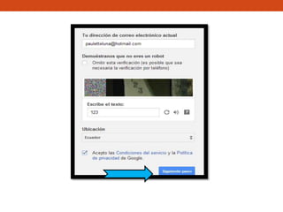 El documento proporciona instrucciones para crear cuentas de Google, Slideshare y Blogger. Explica los pasos para ingresar los datos requeridos como el correo de Gmail, nombre de usuario y contraseña para crear las cuentas de Google y Slideshare. También describe cómo ingresar desde la cuenta de Google para crear un nuevo blog en Blogger y subir archivos HTML para publicarlos.