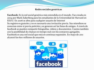 Las redes sociales son aplicaciones web que permiten el contacto entre individuos a través de internet. Existen redes sociales genéricas como Facebook y Twitter que conectan a usuarios sin una temática específica, así como redes verticales enfocadas en intereses particulares como música, fotos o parejas. Dentro de las redes también se distinguen entre horizontales, dirigidas a todo público, y verticales que congregan personas con aficiones o temas en común.