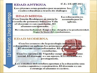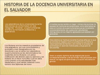 Este documento resume la historia de la docencia en El Salvador desde la época colonial hasta la actualidad. Describe los diferentes tipos de maestros que han existido a lo largo de la historia del país y cómo se ha ido profesionalizando la carrera docente con el tiempo. También identifica algunos desafíos actuales como el uso continuo de métodos tradicionales a pesar de las capacitaciones recibidas.