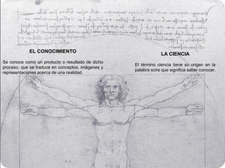 El documento describe el conocimiento, la ciencia y la tecnología. Define el conocimiento como un producto del proceso de aprendizaje que se traduce en conceptos e imágenes sobre la realidad. Define la ciencia como un conjunto de conocimientos verificables, sistemáticamente organizados y obtenidos metodológicamente, relacionados con un objeto de estudio. Define la tecnología como la aplicación de los conocimientos científicos para satisfacer necesidades mediante la producción de bienes y servicios.
