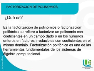 Este documento describe diferentes métodos para factorizar polinomios, incluyendo sacar factores comunes, diferencias de cuadrados, trinomios cuadrado perfectos, y la regla de Ruffini. También define ecuaciones lineales, de segundo grado, de tercer y cuarto grado, y ecuaciones bicuadradas.