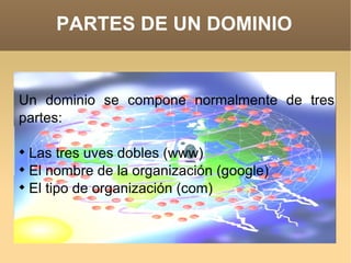 Un dominio o nombre de dominio identifica un sitio web de forma única en Internet. Un dominio se compone normalmente de tres partes: las tres uves dobles (www), el nombre de la organización y el tipo de organización, como .com o .edu. La ICANN es la organización encargada de administrar los nombres de dominio y asegurar que cada uno sea único a nivel mundial.