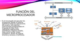 El documento habla sobre varios temas relacionados con la informática, incluyendo las funciones del microprocesador, la memoria RAM, las partes del microprocesador, formas de obtener un driver, software, importancia de las redes sociales, puertos de conexión, función del sistema operativo, dispositivos de entrada, almacenamiento y salida, ejemplos de hardware y sistemas operativos, y la función del driver.