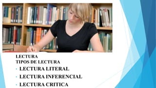 Este documento describe tres tipos de lectura: lectura literal, lectura inferencial y lectura crítica. La lectura literal se centra en los detalles explícitos del texto. La lectura inferencial requiere un mayor grado de abstracción para comprender el significado más allá de lo explícito a través de relaciones e hipótesis. La lectura crítica es evaluativa e implica emitir juicios valorativos sustentados sobre la exactitud y validez del contenido del texto.