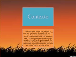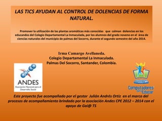 El documento describe un proyecto que busca promover el uso de plantas aromáticas para aliviar dolencias entre estudiantes de un colegio en Palmas del Socorro, Colombia. El proyecto determinará qué plantas se usan comúnmente en la región para esto, e incorporará este conocimiento en el aula a través de las TIC para motivar a los estudiantes.