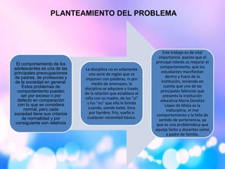 Este documento describe estrategias educativas para mejorar el comportamiento de los estudiantes en una institución educativa. Explica que el comportamiento de los adolescentes es una preocupación principal y que la falta de disciplina, mal comportamiento y falta de sentido de pertenencia son problemas que afectan a la institución. Propone analizar las causas del mal comportamiento a través de grupos focales con los estudiantes y de acuerdo a las teorías de aprendizaje de Skinner.