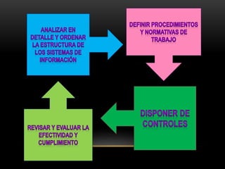 Este documento presenta información sobre seguridad de la información. Define conceptos clave como confidencialidad, integridad y disponibilidad. Explica los tipos de seguridad como física, técnica y de sistemas. También describe estándares y marcos como ISO, COBIT, ISACA. Finalmente, analiza tendencias tecnológicas emergentes y amenazas a la seguridad de la información.