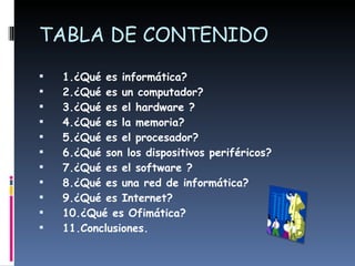 Este documento trata sobre la informática y el tratamiento de la información. Explica que el tratamiento de la información puede ser manual o automático a través de dispositivos. La informática estudia el tratamiento automático de la información mediante sistemas computacionales para facilitar el trabajo de personas en diferentes áreas. Los sistemas informáticos están compuestos de hardware y software, y los computadores son máquinas que procesan información de entrada para generar información de salida.