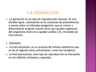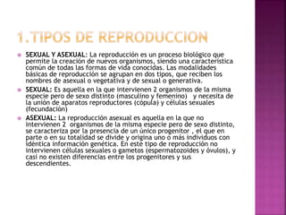 La reproducción puede ser sexual o asexual. La reproducción sexual involucra dos progenitores de sexos opuestos, resultando en descendientes que son una mezcla de las características de ambos. La reproducción asexual no involucra gametos y los descendientes son idénticos al progenitor único. Un tipo de reproducción asexual es la gemación, donde se forman yemas en el progenitor que luego se separan para formar nuevos organismos.