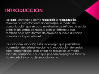El documento describe la historia y evolución de la radio desde sus inicios hasta la actualidad. Comenzó con las primeras transmisiones de ondas de radio a principios del siglo XX y ha evolucionado hasta convertirse en un medio de comunicación digital disponible a través de Internet, con una gran variedad de formatos y usos como la radio para discapacitados y las radios comunitarias.