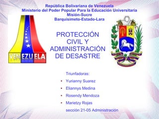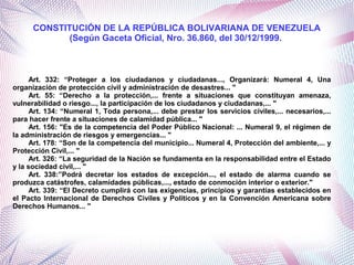 El documento presenta información sobre la protección civil y administración de desastres en Venezuela según la constitución y leyes del país. Explica que la constitución establece el derecho a la protección frente a amenazas y la participación ciudadana en situaciones de calamidad. También presenta extractos de decretos y leyes que regulan la organización nacional de protección civil, sus funciones de planificación y coordinación, así como la definición de protección civil y sus características de desarrollar planes de respuesta, informar a la población y brindar