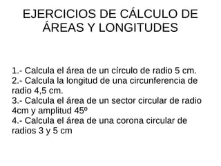 El documento presenta ejercicios de geometría que involucran posiciones relativas y cálculos de áreas y longitudes de figuras circulares. En la primera sección se piden dibujar diferentes configuraciones de circunferencias concéntricas, secantes y tangentes. La segunda sección propone calcular el área de un círculo, la longitud de una circunferencia, el área de un sector circular y la de una corona circular, para figuras con radios dados.