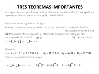 Este documento presenta tres teoremas importantes de probabilidad condicional: el teorema de la probabilidad total, el teorema de Bayes y el teorema de multiplicación. También define el concepto de partición de un espacio muestral y la independencia de eventos.