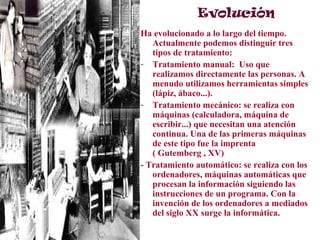 El documento aborda la evolución de la informática y los tipos de tratamiento de la información, que incluyen el manual, mecánico y automático. Se detallan las etapas históricas de desarrollo de los ordenadores, así como sus características, clasificación y componentes tanto de hardware como de software, incluyendo tipos de sistemas operativos y diversas aplicaciones. Finalmente, se describen los periféricos asociados a los ordenadores y la importancia del tratamiento automático de la información en la actualidad.