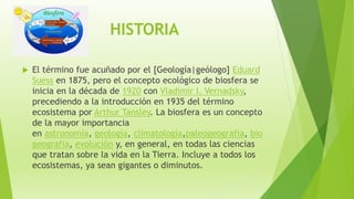 La biosfera es el sistema formado por el conjunto de seres vivos en la Tierra y sus interacciones. Se extiende por la superficie terrestre y marina, así como en las capas más superficiales de la corteza terrestre. La biosfera incluye todos los ecosistemas, desde los más grandes hasta los más pequeños, y mantiene la vida a través de procesos como la fotosíntesis, las cadenas tróficas y la homeostasis.