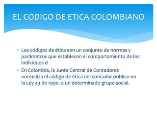 El código de ética en Colombia, establecido por la ley 43 de 1990, regula el comportamiento de los contadores públicos y se alinea con normas internacionales de contabilidad. La comparación entre el código colombiano y el de la IFAC revela diferencias en la claridad sobre faltas éticas y la confidencialidad, donde este último es más explícito. Ambos códigos comparten principios como la objetividad, aunque la forma en que abordan ciertos aspectos éticos puede variar.