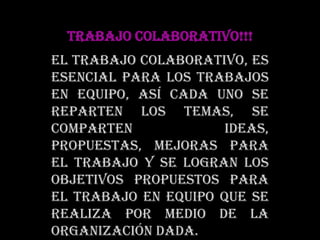 Este documento presenta los aspectos fundamentales del trabajo colaborativo en equipo. Explica que el trabajo colaborativo requiere que cada miembro del equipo asuma una parte del tema, comparta ideas y propuestas, y trabaje hacia los objetivos acordados. También destaca la importancia de compartir ideas para desarrollar el tema de la mejor manera posible, comprender a profundidad el tema asignado, y que el líder guíe al equipo y enfrente los obstáculos de manera integral.