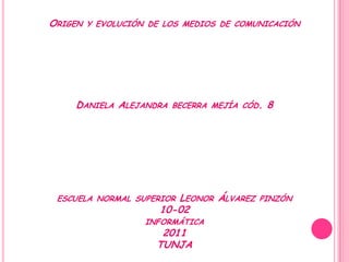 Este documento describe la historia y evolución de varios medios de comunicación importantes como la imprenta, la radio, el teléfono, los libros, los periódicos, el cine, la televisión e Internet. Explica brevemente el origen y desarrollo de cada uno a lo largo de la historia, desde su invención hasta las mejoras tecnológicas más recientes. Finaliza proporcionando varias fuentes bibliográficas relacionadas con cada medio.