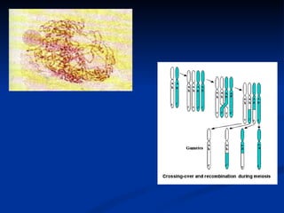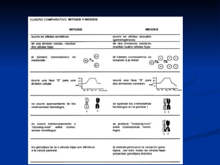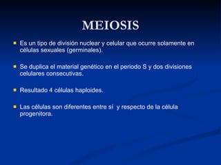 La meiosis es un tipo de división celular que ocurre en las células sexuales y genera 4 células haploides a partir de una célula diploide original. En la primera división meiótica, los cromosomas homólogos se separan hacia polos opuestos, mientras que en la segunda división meiótica, las cromátidas hermanas se separan. El resultado final son 4 células haploides genéticamente únicas debido al entrecruzamiento de los cromosomas durante la meiosis.