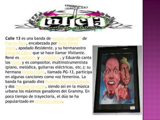 Música Urbana fue un grupo de jazz-rock formado en Barcelona en 1976 por el pianista Joan Albert Amargós con el objetivo de crear un tipo de rock propio e independiente del estilo anglosajón. El grupo tuvo una vida corta pero influyente. Calle 13 es una banda puertorriqueña de música urbana liderada por René Pérez "Residente" y Eduardo Cabra "Visitante", que ha ganado numerosos Grammys Latinos.