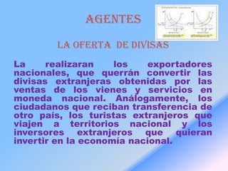El resumen presenta información sobre agentes que ofrecen y demandan divisas en un mercado. Identifica a exportadores e importadores, turistas, receptores de transferencias y inversionistas como los principales agentes. Explica que los exportadores ofrecen divisas al querer convertir sus ganancias en moneda nacional, mientras que los importadores demandan divisas para pagar por bienes y servicios extranjeros.
