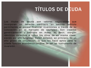 Este documento proporciona información sobre diferentes tipos de títulos de deuda, incluyendo sus características, requisitos y ejemplos. Explica que los títulos de deuda pueden ser emitidos por gobiernos, bancos u otras empresas e incluyen detalles sobre instrumentos específicos como CETES, Bondes, Bonos IPAB y Udibonos. También describe las clasificaciones, emisores, propósitos y procesos de valuación de los títulos de deuda.