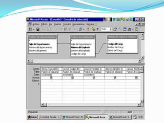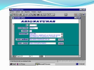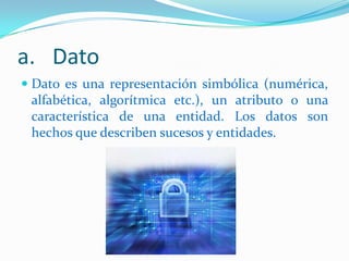 El documento describe los conceptos básicos de las bases de datos, incluyendo: (1) los tipos de datos como texto, numérico y fecha, (2) la diferencia entre datos e información, (3) los componentes clave de un sistema de información como archivos, carpetas, campos y registros, y (4) herramientas comunes como consultas, informes y lenguajes de consultas como SQL.