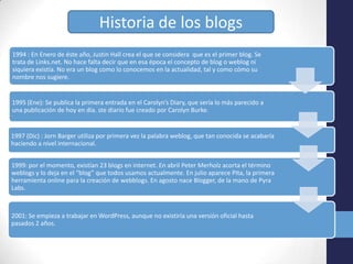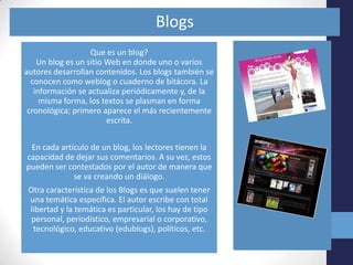 Un blog es un sitio web donde uno o más autores publican contenido de forma periódica y cronológica. Los lectores pueden comentar y participar en diálogos. Los blogs suelen tener una temática específica y dar libertad de expresión al autor. Se considera que el primer blog data de 1994 y su popularidad creció rápidamente en la década de 2000 con el surgimiento de plataformas como Blogger, WordPress y Tumblr. Existen blogs personales, de negocios, educativos y sobre una amplia variedad de temas.