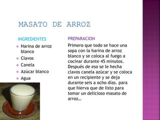 El documento contiene recetas para preparar diferentes platos típicos ecuatorianos como masato de arroz, queso, envoltura de hojas de ría y envueltos de miracho. Se describen los ingredientes necesarios y los pasos para cocinar cada plato, incluyendo detalles como tiempos de cocción y procesos como hervir, mezclar y prensar.