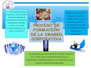 El documento habla sobre la identidad corporativa, la imagen corporativa y sus elementos. Explica que la identidad corporativa representa la esencia de una empresa mientras que la imagen corporativa es la percepción que tiene la sociedad de la empresa. Los elementos clave de la imagen corporativa incluyen el nombre, logo, eslogan, sitio web y materiales de marketing como folletos. También discute los niveles, formas y públicos de la comunicación corporativa y el impacto de Internet en esta área.