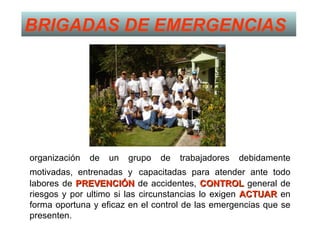El documento describe las brigadas de emergencia, su marco legal según la Ley 9 de 1979 y las resoluciones 2400 de 1979 y 1016 de 1989, y sus funciones y objetivos. Estas brigadas están compuestas por trabajadores voluntarios capacitados para prevenir accidentes, controlar riesgos y actuar en emergencias. Su finalidad es prevenir lesiones y pérdidas a través de la capacitación, el entrenamiento y la actuación oportuna ante emergencias.