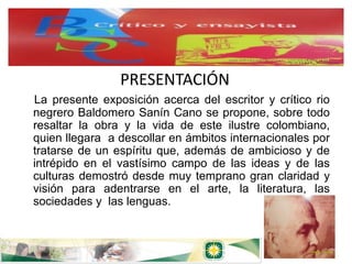 Baldomero Sanín Cano fue un escritor y crítico colombiano que destacó a nivel internacional. Vivió entre 1875 y 1957 y publicó varios libros y ensayos. Trabajó como periodista en Buenos Aires entre 1925 y 1936, y representó a Colombia en la Sociedad de Naciones. También fue rector de la Universidad de Popayán y pasó sus últimos años escribiendo editoriales para el periódico El Tiempo de Bogotá.