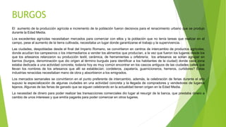 El documento presenta una maqueta sobre la ciudad de Burgos durante la Edad Media. Explica que el aumento de la producción agrícola y la población llevaron al renacimiento urbano, con las ciudades convirtiéndose en centros de intercambio comercial. Los artesanos se agrupaban en barrios dedicados a una actividad específica. Las ferias permitieron la especialización de algunas ciudades en un producto en particular. La necesidad de dinero dio lugar al resurgir de la banca. La maqueta representa estas