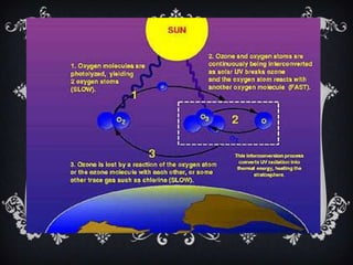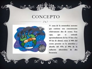 La capa de ozono se encuentra en la estratosfera entre los 15 y 40 km de altitud y contiene el 90% del ozono en la atmósfera, el cual absorbe el 97-99% de la radiación ultravioleta. Fue descubierta en 1913 y estudiada por Dobson, quien estableció una red de monitoreo mundial. El ozono se forma por reacciones fotoquímicas en la capa y protege la vida en la Tierra, pero observaciones recientes muestran que está seriamente amenazada.