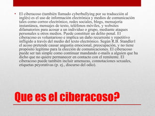 El documento describe el ciberacoso, incluyendo sus características, tipos y cómo operan los ciberacosadores. El ciberacoso implica el uso de medios electrónicos como correo electrónico, redes sociales y mensajes de texto para acosar a una persona de manera repetida. Los ciberacosadores a menudo difunden información falsa sobre las víctimas y manipulan a otros contra la víctima. Las redes sociales son comúnmente usadas para ciberacoso, especialmente entre jóvenes e incluso niños pequeños.